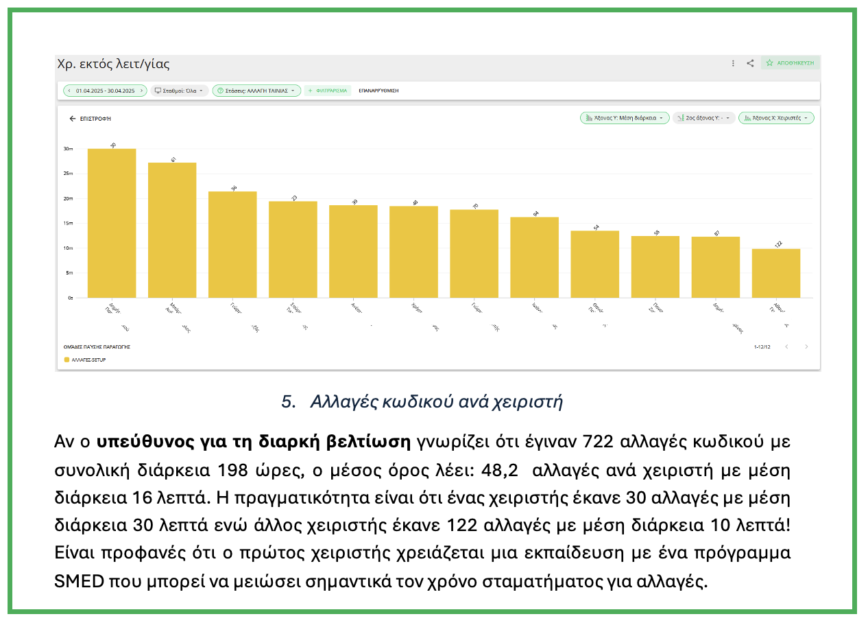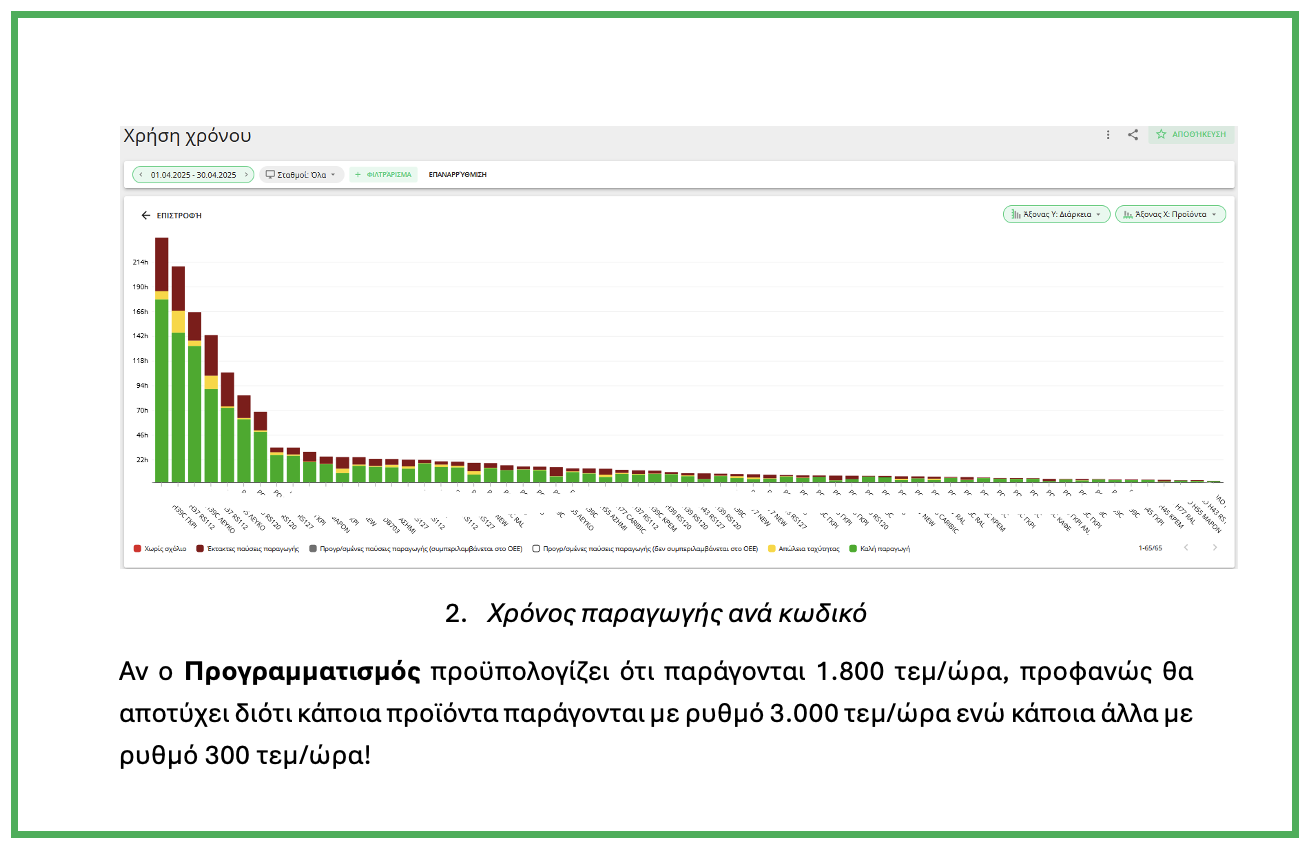 Θα δούμε παρακάτω μερικά παραδείγματα που έχουμε αντλήσει από μια εφαρμογή του Evocon, που μας δίνει όλα τα δεδομένα της παραγωγής ανά λεπτό, αλλά μας παρέχει και τα εργαλεία να κάνουμε αναλύσεις και συγκρίσεις. Τα γραφήματα είναι πραγματικά και προέρχονται από Εταιρεία που χρησιμοποιεί το Evocon. Έχουμε αποκρύψει ελαφρώς τα ονόματα, προϊόντα κλπ.