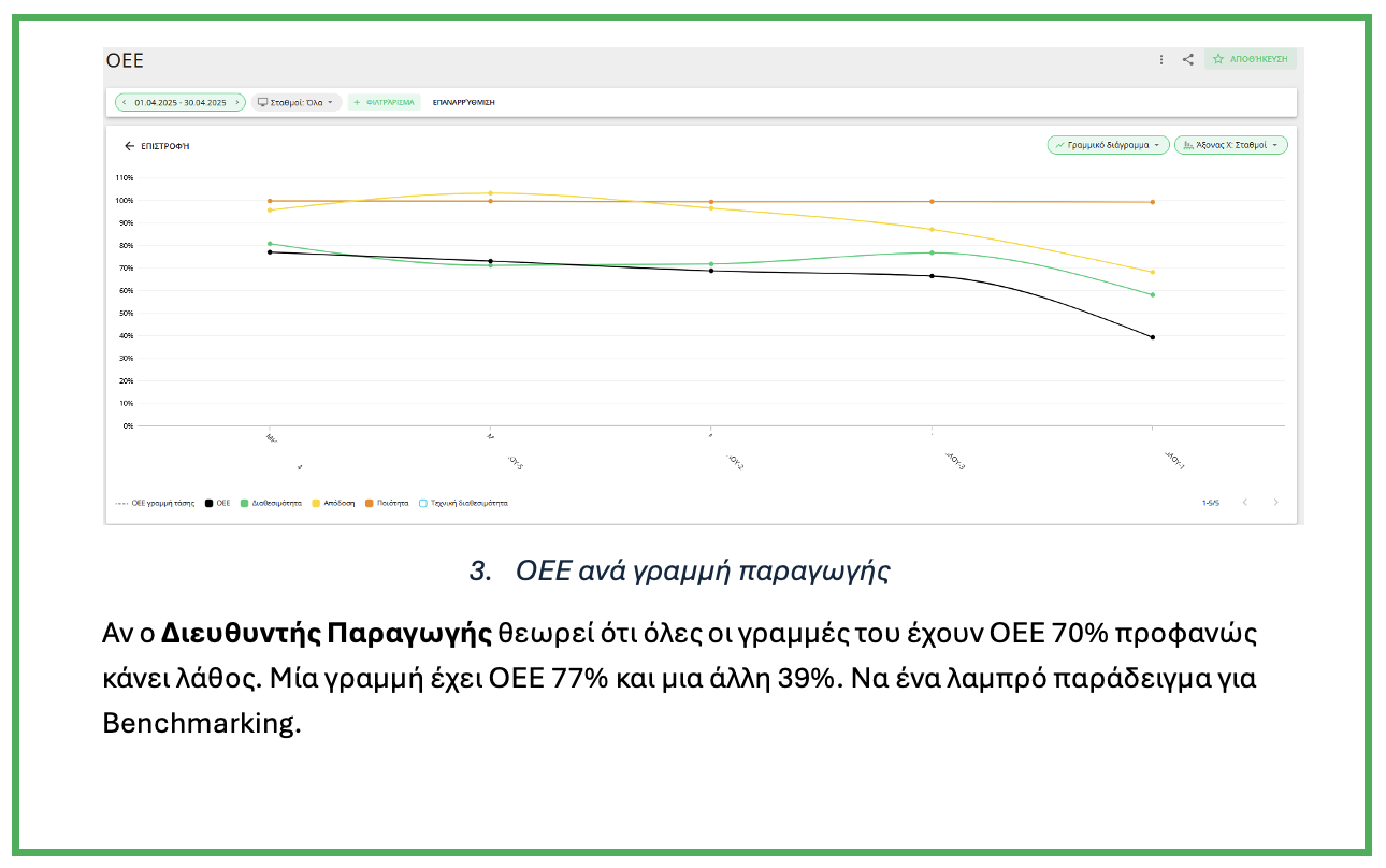 Με όσα είδαμε παραπάνω, πιστεύουμε ότι έγινε σαφές, ότι αν παρακολουθούμε τη δική μας παραγωγική δραστηριότητα με τον σωστό τρόπο, μπορούμε να αξιοποιήσουμε τα δικά μας, πρωτογενή δεδομένα για Benchmarking. Εύκολα εντοπίζουμε την αποδοτικότερη γραμμή παραγωγής, τον αποτελεσματικότερο χειριστή, τον ευκολότερο (και τον δυσκολότερο) κωδικό. Ακόμα και αν έχουμε μια γραμμή παραγωγής και έναν χειριστή, μπορούμε να αξιοποιήσουμε τα δεδομένα ανά βάρδια. Θα διαπιστώσουμε ότι η καλύτερή μας βάρδια είχε ΟΕΕ πχ 80% και θα θέσουμε αυτό σαν στόχο. Παράλληλα, με κατάλληλη αξιοποίηση των στοιχείων αυτών, συμβάλλουμε στην προσπάθεια βελτίωσης όλων των τμημάτων. Τέλος, με τα ίδια στοιχεία αξιολογούμε και την αποτελεσματικότητα των διορθωτικών ενεργειών.