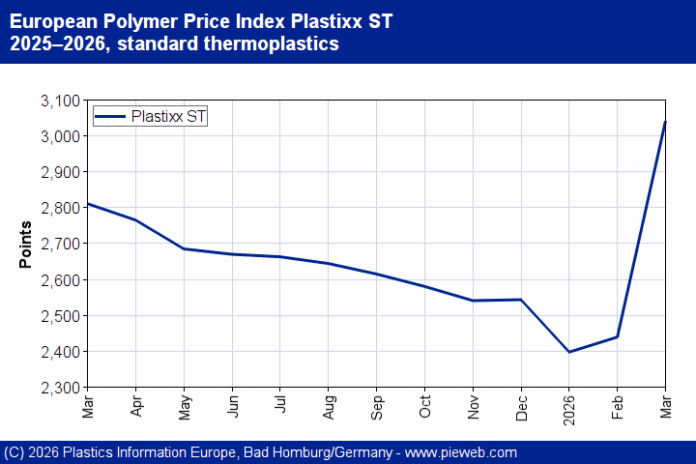 PE: The European ethylene contract rose EUR 50/t in March. However, the Iran war resulted in dramatic cost pressure during the month as energy and raw material prices exploded. Producers have responded with weekly price increases, with quotations rising several hundred euros in a short period of time – up to the end of March, some hikes even exceeded EUR 600/t. Supply also suffered from the escalation in the Middle East conflict. The spot market dried up. In most cases, only contracts were served. Several producers put a stop to incoming orders and offered material at prices calculated by the day. The situation was compounded by a revival on the demand side. This was not only a seasonal development; buyers were looking to build stock for fear availability would soon become a serious issue. For April, the prospects are catastrophic. Prices could skyrocket by more than EUR 1,000/t compared with February. The development of the C2 contract (up EUR 450/t) indicates the severity of the situation. The supply side is unlikely to ease as demand is anticipated to remain stable as long as the war in Iran continues. Converters are buying what they can get. Only the Easter holidays may temporarily dampen activity.